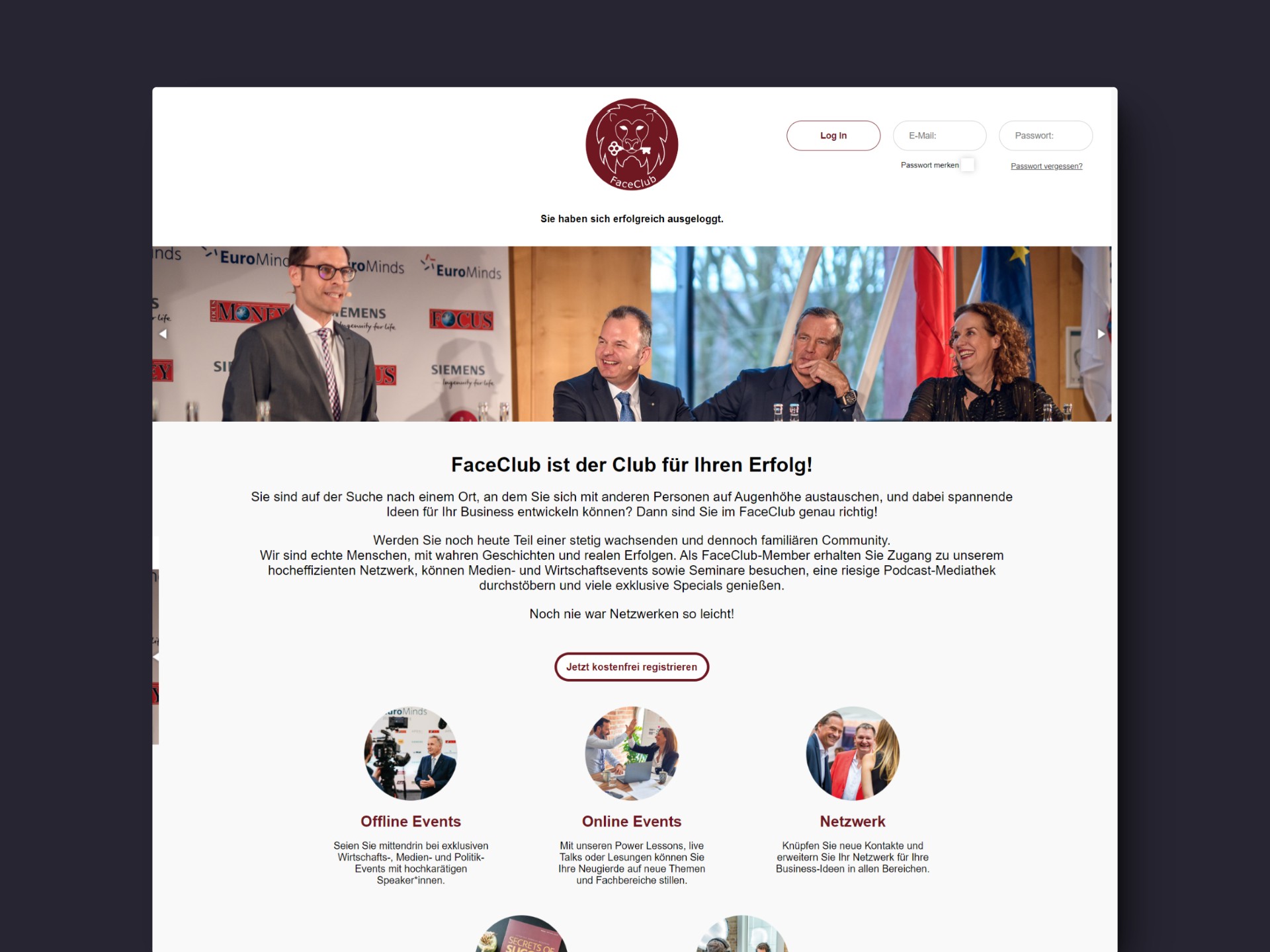 Face-Club.com ist ein exklusiver Mitgliederclub, der seiner Community seit 2019 einen Raum bietet, in dem die Bedürfnisse und Interessen der Mitglieder im Mittelpunkt stehen und in dem gegenseitige Unterstützung gefördert wird. Mitglieder erhalten u.a. exklusiven Zugang zu besonderen Veranstaltungen.