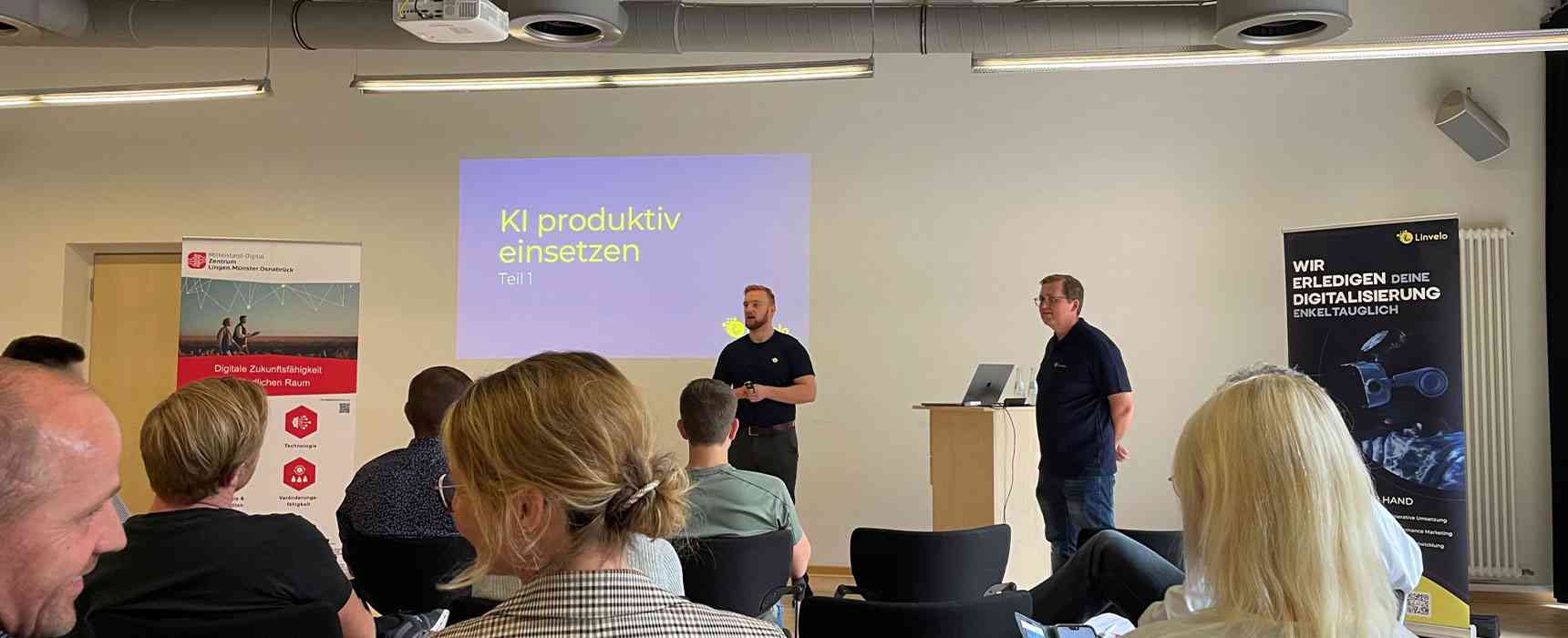 „Geschäftsführer und Abteilungsleiter mittelständischer Unternehmen erfahren in unseren Workshops, wie Sie Geschäftsprozesse mit Hilfe von KI messbar und effektiver gestalten und so 10-12 Stunden Arbeitszeit pro Woche einsparen.