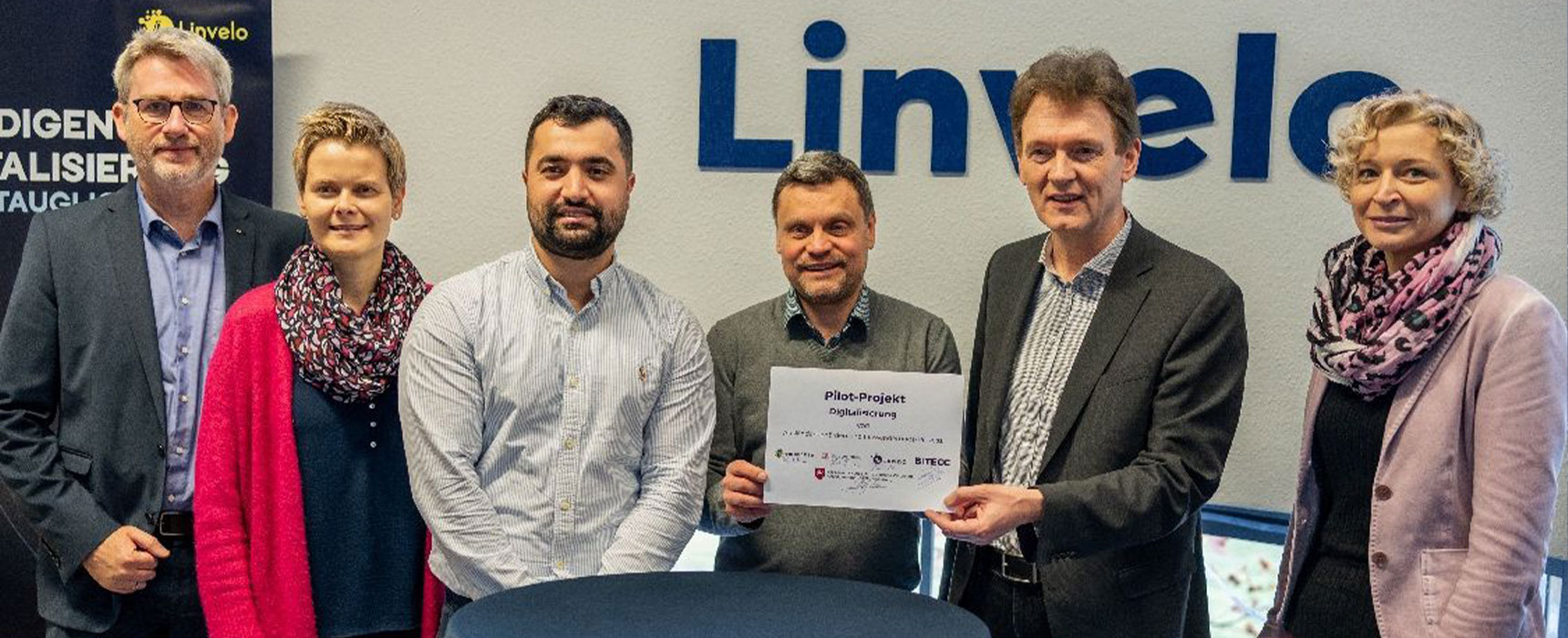 Olaf Lies im Namen des Niedersächsischen Ministeriums für Wirtschaft, Bauen, Verkehr und Digitalisierung, Dieter Krone im Namen der Stadt Lingen, Dirk Lüerßen im Namen der Wachstumsregion Ems-Achse, Ferhat Asi und Oleksandr Kotsyuba im Namen von Linvelo @BITECC haben den Start des „Pilot-Projekt Digitalisierung von Ausländerbehörden und Einwanderungs-Prozess“ unterzeichnet.